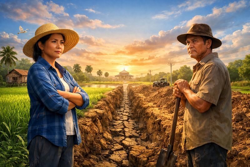 บนผืนนาที่ครั้งหนึ่งเคยเป็นของตระกูลเดียวกัน ลำรางสายเล็กที่พาน้ำจากคลองหลวงมาหล่อเลี้ยงชีวิตมานานกว่า 40 ปี กลับกลายเป็นชนวนของสงครามเงียบระหว่างเพื่อนบ้าน 2 คน เมื่อดินกลบลำราง น้ำก็หยุดไหล และหัวใจ 2 ดวงก็เริ่มแตกร้าว แต่กฎหมายจะยืนอยู่ข้างใคร?